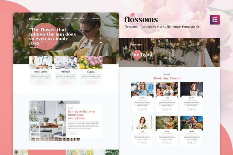 Flossoms Nulled is Elementor Template kit for flower shop, flower decoration, Florist Boutique, Decoration Store, wedding decoration businesses and other similar businesses. With its beautiful design, and awesome, its the best fit for this Industry and business..