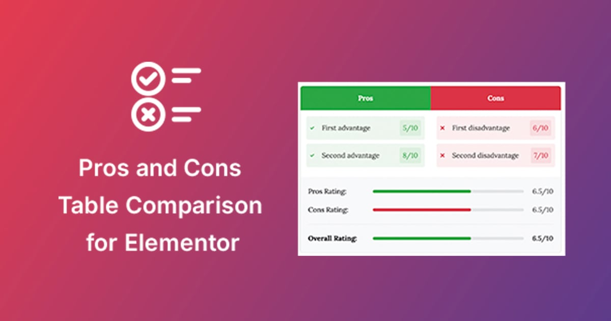 A powerful and flexible Elementor widget for creating beautiful pros and cons comparison tables with ratings and rich customization options.