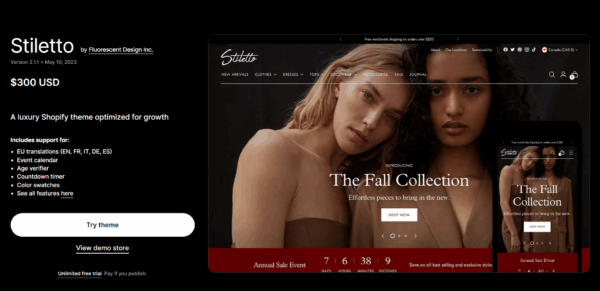 The Stiletto Shopify Theme is a trendy and sophisticated solution designed specifically for fashion and apparel stores. With its modern and elegant design, Stiletto provides a visually stunning platform for showcasing your products and creating a memorable shopping experience for your customers. Let’s dive into some of its range of features.