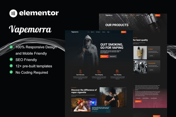 Vapemorra Nulled is professional Elementor Template Kit for Vape Store. This template kit is perfect for any business or service related to vape, such as vape community & shop, vape store, electric cigarette etc. It has 12+ pre-built templates with clean design and modern style.