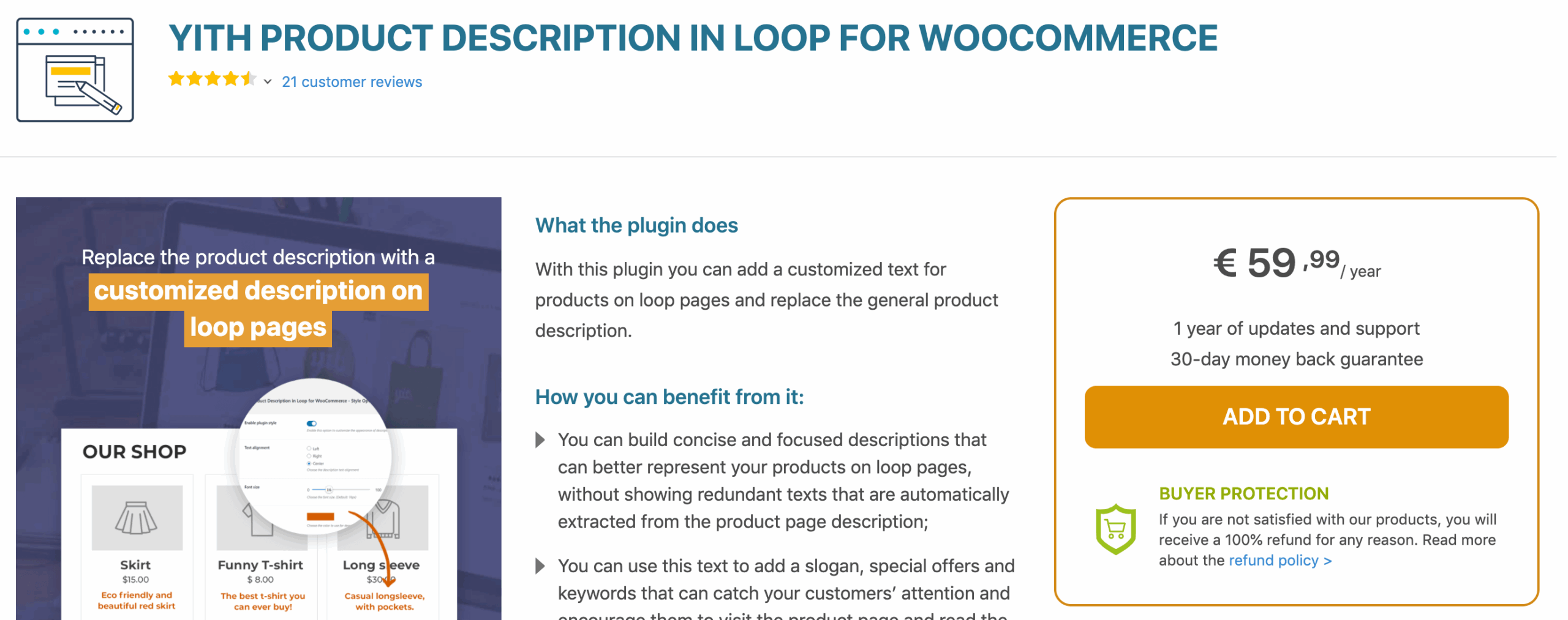 This is the reason why we have designed this plugin: we realised that the plugin description texts on our home page did not faithfully represent what the plugin is, as the short text used to be taken out of the product detail page automatically. The loop text used to show a few lines of nonsense text, sometimes even broken sentences.